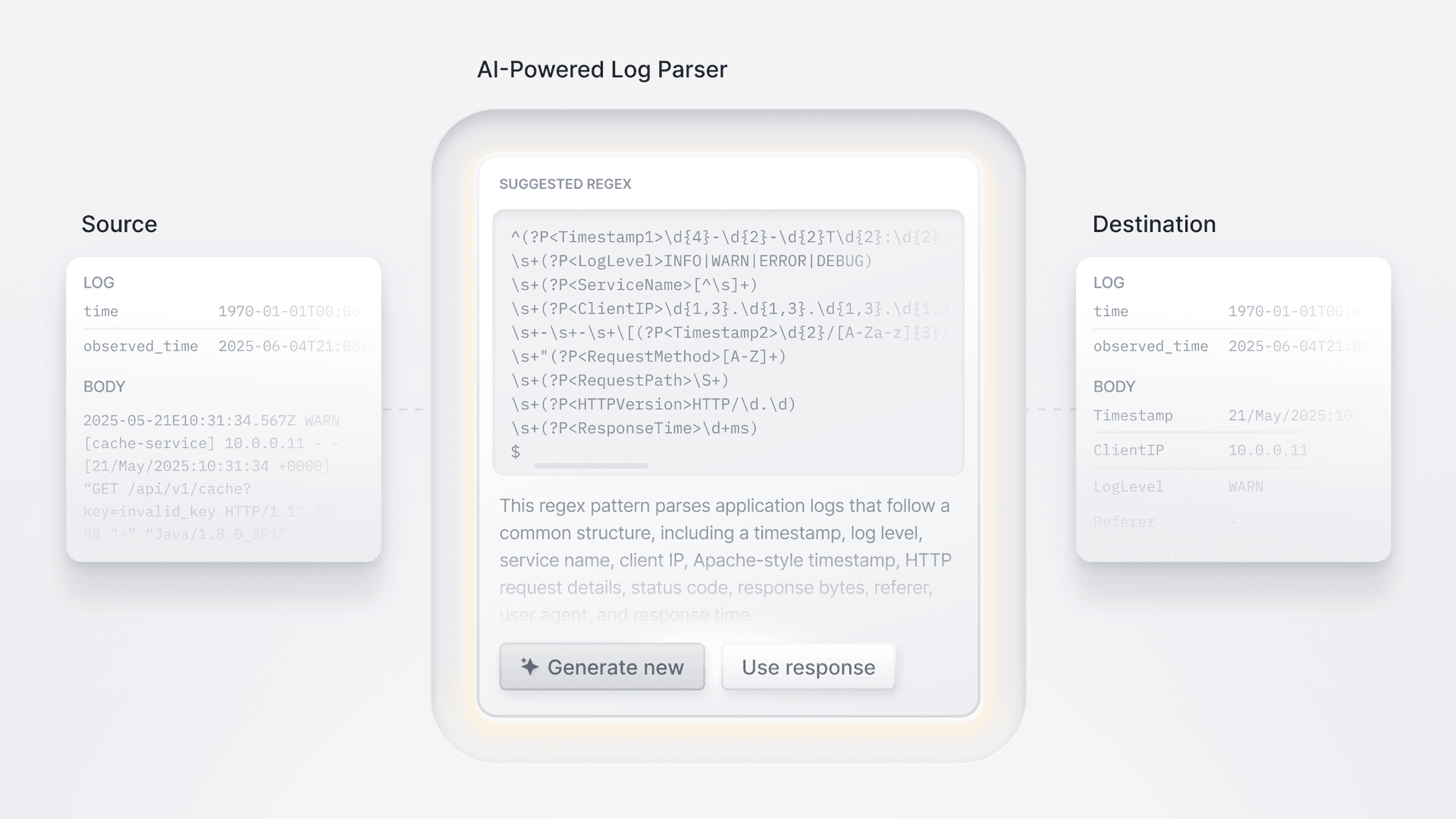 - LLM-Driven Pattern Discovery – When you trigger the AI-powered Regex Parser, it’ll send a lightweight sample to an LLM model. In seconds the model returns a fully formed regular-expression pattern tailored to that log line.