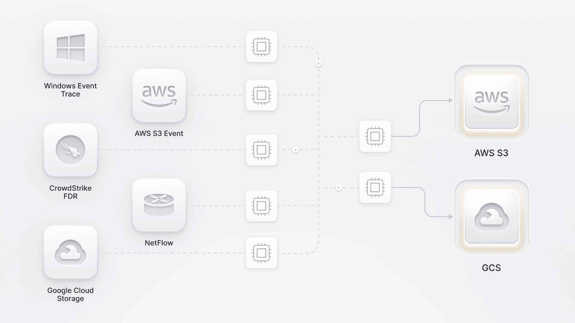 Every new integration follows the same design philosophy: minimal clicks, maximum control. Detect a surge of DNS errors in ETW and pivot to NetFlow to confirm packet loss; store raw Crowdstrike logs in S3 for seven years while streaming pared-down alerts to Sentinel; or replay six months of GCS archives into Google SecOps the day before an audit. Your pipeline, your telemetry, your rules.